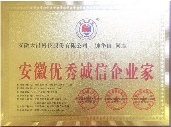 近日,安徽大昌科技股份有限公司榮獲“企業(yè)信用評價(jià)AAA級信用企業(yè)”榮譽(yù)稱號(hào),董事長鐘華山先生被評為安徽優(yōu)秀誠信企業(yè)家。