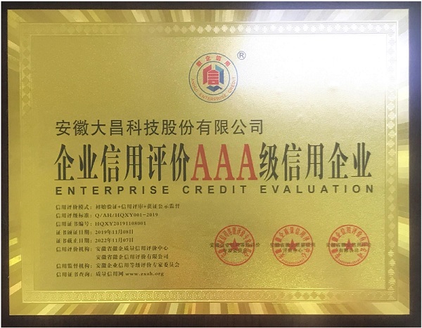 在董事長鐘華山的帶領(lǐng)下,安徽大昌科技股份有限公司自成立以來一直規(guī)范自身經(jīng)營,重視誠信體系建設(shè),贏得了業(yè)界的高度贊譽(yù)。此次獲得3A級企業(yè)信用評價(jià)等級證書,標(biāo)志著公司的軟實(shí)力和信譽(yù)度的提升。我們也將再接再厲,一如既往地樹立誠信經(jīng)商、踐行守諾的信用意識(shí),完善企業(yè)信用體系建設(shè),更好的服務(wù)于我們的客戶。